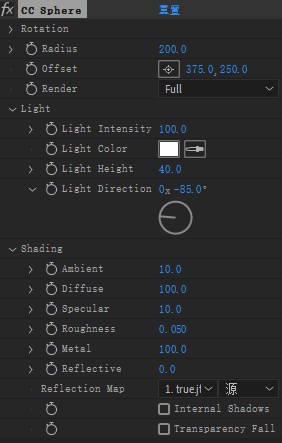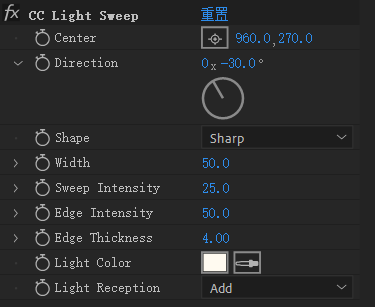 Width:光束宽度Sweep Intensity:亮度Edge Intensity:光线在边缘上的强度Edge Thickness:光线在边缘上的宽度Light Color:光的颜色Light Reception:光线与原始图像交互方式Add:以“相加”模式混合Composite:直接叠加到原始图像Cutout:无光照区域变透明