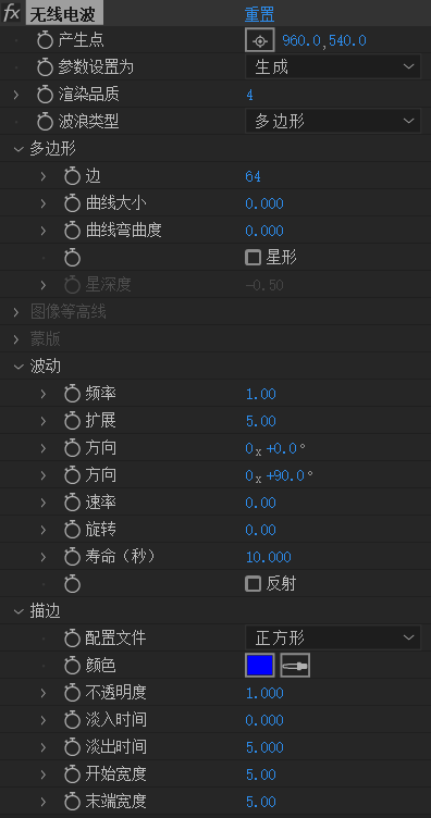 波动:频率:出生多少线条扩展:线条往外扩的距离方向:整体旋转的角度速率:向右扩散的距离旋转:每个波纹比较上一个波纹旋转角度寿命:波纹消失时间