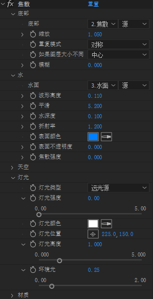 效果水面文字:文字预合成;新建纯色层,于纯色层添加效果;底部选择文字;水面钻则背景;表面不透明度与灯光强度改为0;调整波形高度与平滑