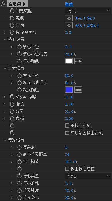 核心设置:闪电核心的亮度和颜发光设置:闪电发光的亮度和颜色Alpha障碍:闪电被非透明物品阻挡,击打在非透明物体上分叉:闪电分叉个数衰减:闪电流消失速度